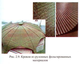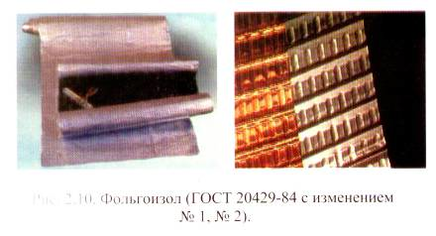 Фольгоизол (фольгопласт) - рулонный двухслойный материал, состоящий из тонкой рифленой или гладкой алюминиевой фольги, покрытой с нижней стороны защитным битумно-резиновым составом. Он предназначен для устройства кровель и парогидроизоляции зданий и сооружений, герметизации стыков. Рулон имеет длину Юм, ширину 1м. Внешняя поверхность фольгоизола может быть окрашена в различные цвета атмосферостойкими лаками. Фольгоизол - долговечный материал, не требующий ухода в течение всего периода его эксплуатации (рис. 2.10).