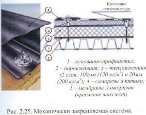 Механически закрепляемая система устройства кровли из полимерных мембран применяется в том случае, если использование балластной системы исключено (скатная кровля, невозможность дополнительной нагрузки на несущие конструкции, неорганизованные сливы - отсутствие парапетов и т.д.) рис. 2.25.