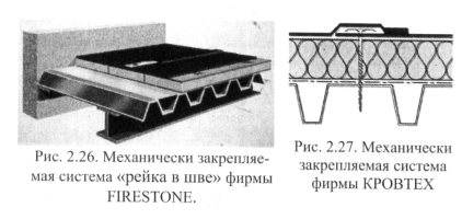 Механически закрепляемая система существенно повышает прочность швов. В такой системе используются широкие листы мембран, свободно укладываемые поверх соответствующего основания. Они механически крепятся к основанию с помощью реек, которые накладываются поверх мембраны и затем защищаются специальными самоклеющимися полосами шириной 150 мм. Расстояние между рейками обычно 2 м, хотя в зависимости от конкретных условий может меняться. Плиты теплоизоляции надежно крепятся отдельно от мембраны.