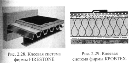 Приклеиваемая система. При устройстве кровли из полимерных мембран, так называемую, «полностью приклеенную» кровельную систему рекомендуется применять в кровлях со сложными очертаниями, большим уклоном, ограниченной несущей способностью, а также испытывающих высокие ветровые нагрузки. При этом листы мембраны, скрепленные друг с другом по особой технологии, закрепляются на основании при помощи специального монтажного клея. Система является самой легкой и обладает высоким сопротивлением подъемной силе ветра. Примерами такой системы могут служить кровли из полимерных мембран FIRESTONE (рис. 2.28.) или КРОВТЕХ (рис. 2.29.)