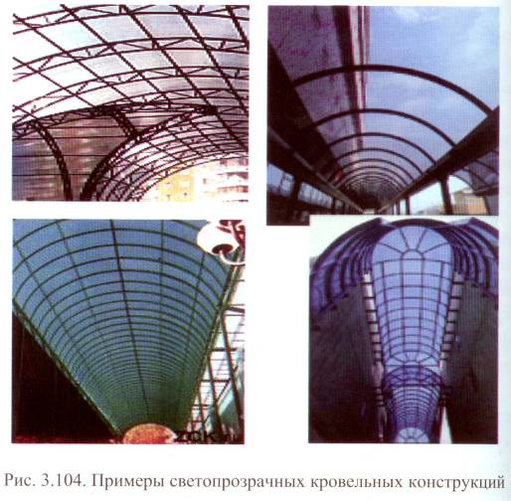 Светопропускающие кровли могут быть выполнены в виде отдельных наклонных скатов, арок, пирамид, куполов, многоугольников и т.п. (рис. 3.104).