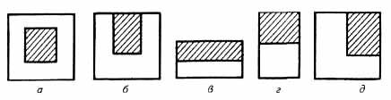 а, б - центричні, у - фронтальна, м - глибинна, д - кутова.