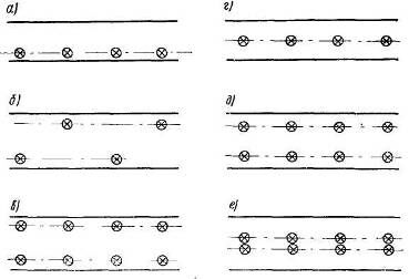 а – односторонняя; б – двухрядная в шахматном порядке; в-двухрядная прямоугольная; г – осевая; д – двухрядная прямоугольная по осям движения; е – двухрядная прямоугольная по оси улицы