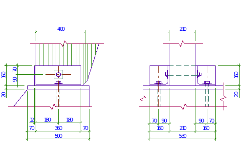 Уголки, фиксирующие стойку поперечной рамы, принимаются из условия расположения болтов. Согласно табл. 39 [3]: минимальные расстояния от центра болта до края уголка должны быть не менее 1,5d = 1,5•16 = 24 мм. Для обеспечения удобства монтажа принимаем уголок L160x12. Крепление траверсы (уголков) башмака к фундаменту предусматриваем 2-мя болтами d = 24 мм.