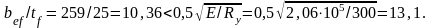 = (530–12)/2 = 259 мм к его толщине tf должно быть не более предельного, определяемого по СНиП [1],