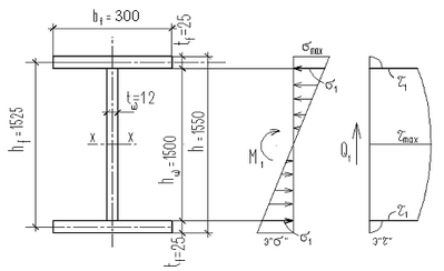 здесь tw – толщина стенки балки, предварительно определяемая по эмпирической зависимости tw = 7 + 3h/1000 = 7 + 3·1500/1000 = 11,5 мм.
