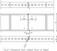 Для уменьшения сварочных напряжений соблюдается определенный порядок сварки (на рис.14 показанный цифрами): сначала свариваются поперечные стыковые швы стенки и поясов, имеющие наибольшую усадку, последними завариваются угловыми швами, имеющими небольшую продольную усадку, участки длиной по 500 мм, оставленные незаверенными на заводе. Это позволяет при монтаже совместить торцы свариваемых элементов отправочных марок, имеющих отклонение в размерах в пределах технологических допусков, и дает возможность поясным листам несколько вытянуться при усадке поперечных швов. Для ручной сварки монтажных стыков применяются электроды Э50.