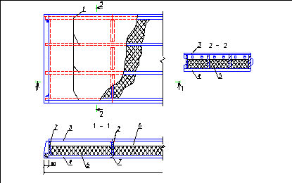 Рис. 2. Конструкция клеефанерной плиты с ребристым каркасом из досок: 1 – продольные ребра; 2 – поперечные ребра;3 – обшивка верхняя; 4 – обшивка нижняя; 5 – утеплитель; 6 – продух; 7 – стык фанеры.