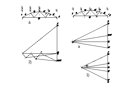 Рис. 6. Определение усилий в элементах фермы: а-загружения и диаграмма усилий от постоянной нагрузки; б-схема загружения снегом и диаграммы усилий; 1-от полного загружения снегом; 2-от одностороннего загружения снегом.