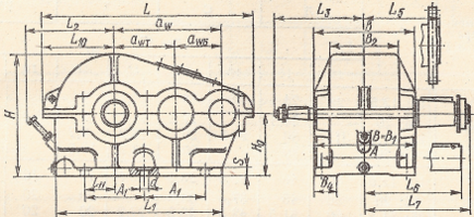 | Типоразмер редуктора | aωб | aωт | A | A1 | B=B1 | B2 | B3 | B4 | L1 | L2 | L3 | L4 | ||||||||||||