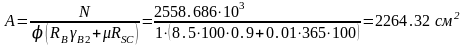 А = 2224,94 * 103/ (0,21 * 100 - 20 * 10-3 * 150) = 123607.78 см2