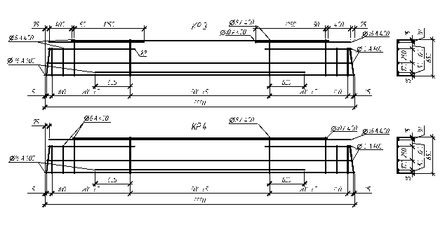 Второстепенная балка армируется каркасами из арматуры класса A400: Rs=355 МПа, Rsw=285 МПа, Rs ser=390 МПа, Es=200000 МПа.
