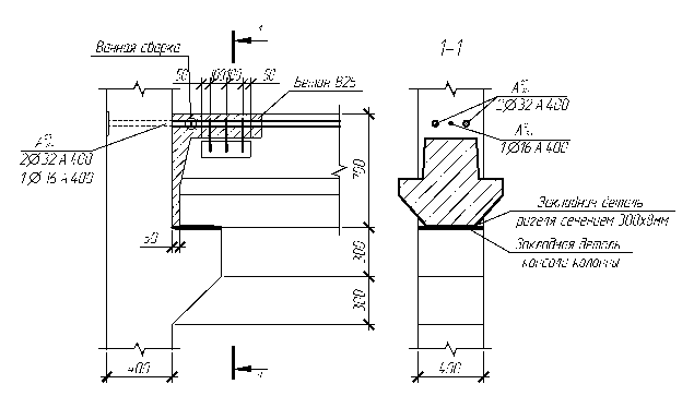 Принимаем 232 A400 и 16 A400 (Аs=1809.6 мм2), т.к. диаметры стыковых стержней и выпусков арматуры ригеля одинаковы, то конструкция стыка является равнопрочной с сечением ригеля и не требует проверки расчетом.