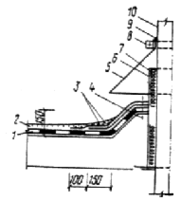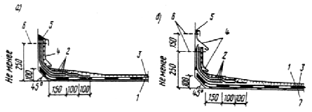 1 - основной водоизоляционный ковер (по табл.2); 2 - слои дополнительного водоизоляционного ковра с верхним слоем из рубероида (или толя) с крупнозернистой или чешуйчатой посыпкой (по п.2.5); 3 - защитный слой (согласно табл.2); 4 - защитный фартук из оцинкованной кровельной стали; 5 - герметизирующая мастика (согласно п.2.9); 6 - оси крепежных элементов (для закрепления слоев водоизоляционного ковра, защитных фартуков);