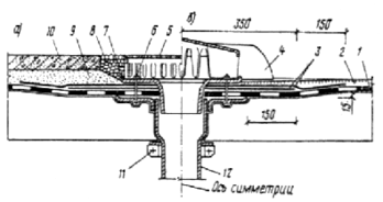 3 - слои дополнительного водоизоляционного ковра из мастик, армированных стеклосеткой или стеклотканью; 4 - струевыпрямитель колпака водоприемной воронки; 5 - съемная крышка водоприемного колпака; 6 - накидная гайка с шайбой; 7 - прижимное кольцо; 8 - гравий фракцией не менее 15 мм; 9 - цементно-песчаный раствор или кварцевый песок (по п. 2.11);