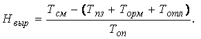 Нвр — установленная норма времени на единицу изделия. В тех производствах, где подготовительно-заключительное время, время на обслуживание рабочего места, на личные надобности и отдых нормируются на смену, норма выработки рассчитывается по следующим формулам: