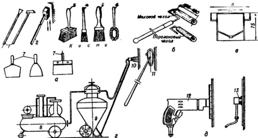 а — ручные инструменты, б — окрасочный валик, в — вискозиметр ВЗ-4, г — агрегат для нанесения шпаклевки, д — шлифовальные машины, 1 — скребки, 2 — держатель для лещади, 3 — макловица, 4 — ручник, 5 — флейц, 6 — кисть для окраски радиаторов, 7 — шпатели, 8 — компрессор, 9 — пневмонагнетательный аппарат, 10 — форсунка для нанесения шпаклевки, 11 — приспособление для шлифовки вручную, 12 — шлифовальная машинка (электрическая), 13 — то же, пневматическая.
