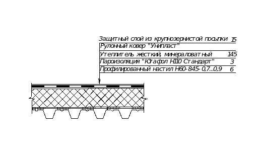 | 6 | Толщина слоёв, м Профилированный настил, 7850 кг/м³ Пароизоляция Ютафол, 600 кг/м³ Утеплитель минераловатный 40-60 кг/м³ Рулонный ковер Унипласт |