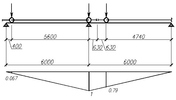 Рис. 2.1- Размещение колес двух кранов на линии влияния опорной реакции.