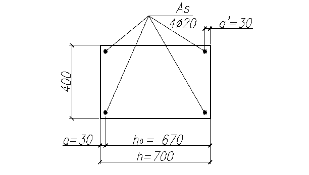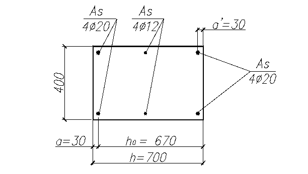 Окончательно принимаем симметричную арматуру 4Ø20АIII c общей площадью AS = 12,56см2. Согласно конструктивным требованиям принимаем промежуточные стержни 2Ø12АIII c АS= 2.26 см2, (Рис. 4.6).