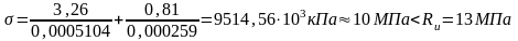 δ= М/W=0,32х10-3/0,000025=12,8 МПа≤Rи =13 МПа х1,2=15,6 МПа