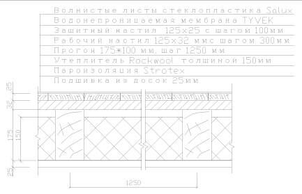 Согласно сортаменту пиломатериалов (ГОСТ 8486-86*Е) принимаем прогон из бруса сечением 175х100 мм. Шаг прогонов - 1,25 м.