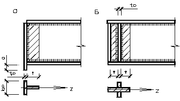 Пояса со стенкой соединяются угловыми швами. Швы воспринимают горизонтальное (Т) и вертикальное (V) сдвигающее усилия на единицу длины, которые определяются по касательным и местным напряжениям: