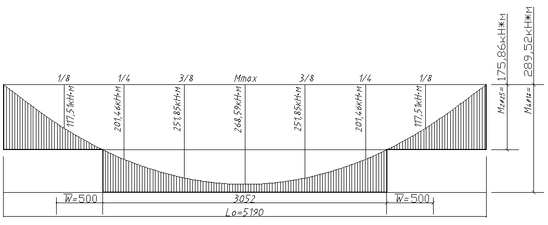 Значения максимальных моментов М4 и М2 наносим на эпюру материалов. В точках пересечения линии М2 и эпюры моментов М верхние стержни будут обрываться. Но для работы верхних стержней необходима их дополнительная заделка с каждой стороны на величину W, равную 20 диаметрам арматуры: