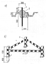 а — геодезический знак закрепления основных или главных разбивочных осей здания до 5 этажей, сооружения высотой до 15 м с продолжительностью строительства до 0,5 года, внутриплощадочных инженерных сетей: 1 — металлический стержень 16 мм; 2 — бетон класса В7,5; б — ограждение знака: 3 — деревянный столб размером 1800х80х80 мм или металлическая труба 30—50 мм; 4 — доска размером 1500х80х20 мм или металлический уголок размером 25х25х2 мм.