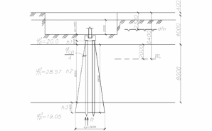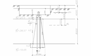 Для среднего давления по подошве PCP Для максимального краевого давления Pmax Для минимального краевого давления Pmin PMAX=274,087 кПа < 1,2R (459,142 кПа) PMIN=216,473 кПа >0 Недогруз фундамента, следовательно необходимо уменьшить размеры до 1,5х2,1 м PMAX=420,362 кПа < 1,2R (454,542 кПа) Недогруз составляет PMIN=313,702 кПа >0 Окончательно принимаем размеры подошвы фундамента для колонны 1: 1,5х2,1 м Эксцентриситет е0: Относительный эксцентриситет е1: краевые давления допускается не проверять. Сечение №2 По полученной в пункте 3.2 величине b и глубине заложения d1, определяем расчетное сопротивление грунта основания R, кПа: Для среднего давления по подошве PCP Недогруз составляет Следовательно необходимо уменьшить размеры до 1,5х1,5 м Недогруз составляет Окончательно принимаем размеры подошвы фундамента для колонны 1: 1,5х1,5 м Сечение №5 По полученной в пункте 3.2 величине b и глубине заложения d1, определяем расчетное сопротивление грунта основания R, кПа: Для среднего давления по подошве PCP Для максимального краевого давления Pmax Для минимального краевого давления Pmin PMAX=292,958 кПа < 1,2R (459,164 кПа) Недогруз составляет PMIN=216,473 кПа >0 Недогруз фундамента, следовательно необходимо уменьшить размеры до 2,4х2,4 м PMAX=375,639 кПа < 1,2R (454,56 кПа) Недогруз составляет PMIN=202,027 кПа >0 Недогруз фундамента, следовательно необходимо уменьшить размеры до 2,1х2,4 м PMAX=440,903 кПа < 1,2R (449,981 кПа) Недогруз составляет PMIN=214,143 кПа >0 Окончательно принимаем размеры подошвы фундамента для колонны 5: 2,1х2,4 м Рисунок 3.1. – Расчетная схема здания Сечение №1 Рисунок 3.2. – Конструкция монолитного отдельного фундамента под колонну 1 Сечение №2 Рисунок 3.3. – Конструкция монолитного отдельного фундамента под колонну 2 Сечение №5 Рисунок 3.3. – Конструкция монолитного отдельного фундамента под колонну 5 Для расчета осадок фундаментов шириной менее 10 м рекомендуется метод послойного суммирования деформаций слоев грунта, на которые разбивается сжимаемая толща основания. Расчет осадки фундамента под колонну 1: Рисунок 3.4. – Схема к расчету осадки фундамента под колонну 1 PMAX=420,362 кПа № слоя Zi, м hi, м Ei Si 0 0 0 - - 19,1 0 1 401,262 - - - 1 0,35 0,35 18,19 6,367 25,4665 0,46667 0,9513 381,734 391,498 19000 0,5769 2 0,95 0,6 16,48 9,888 35,3545 1,26667 0,657 263,629 322,681 10000 1,5489 3 1,55 0,6 16,48 9,888 45,2425 2,06667 0,3992 160,172 211,9 10000 1,0171 4 2,15 0,6 16,48 9,888 55,1305 2,86667 0,2517 100,986 130,579 10000 0,6268 5 2,35 0,2 16,48 3,296 58,4265 3,13333 0,2183 87,6075 94,2966 10000 0,1509 6 2,95 0,6 9,7 5,82 64,2465 3,93333 0,1497 60,0569 73,8322 10000 0,3544 7 3,55 0,6 9,7 5,82 70,0665 4,73333 0,108 43,3363 51,6966 10000 0,2481 8 4,15 0,6 9,7 5,82 75,8865 5,53333 0,081 32,5022 37,9193 10000 0,182 9 4,75 0,6 9,7 5,82 81,7065 6,33333 0,0633 25,4119 28,9571 10000 0,139 10 5,35 0,6 9,7 5,82 87,5265 7,13333 0,05 20,0631 22,7375 10000 0,1091 S= 4,9533 см Расчетная осадка фундамента под колонну 1 меньше предельной, следовательно перепроектирование фундамента не требуется. Расчет осадки фундамента под колонну 2: Рисунок 3.5. – Схема к расчету осадки фундамента под колонну 2 PMAX=333,333 кПа № слоя Zi, м hi,м Ei Si 0 0 0 - - 16,371 0 1 316,962 - - - 1 0,5 0,5 18,19 9,095 25,466 0,66667 0,8203 260,013 288,488 19000 0,6073 2 1,1 0,6 16,48 9,888 35,354 1,46667 0,4423 140,202 200,108 10000 0,9605 3 1,7 0,6 16,48 9,888 45,242 2,26667 0,2377 75,3324 107,767 10000 0,5173 4 2,3 0,6 16,48 9,888 55,13 3,06667 0,1417 44,904 60,1182 10000 0,2886 5 2,5 0,2 16,48 3,296 58,426 3,33333 0,122 38,6694 41,7867 10000 0,0669 6 3,1 0,6 9,7 5,82 64,246 4,13333 0,0824 26,1018 32,3856 10000 0,1555 7 3,7 0,6 9,7 5,82 70,066 4,93333 0,059 18,7008 22,4013 10000 0,1075 S= 2,7035 Расчетная осадка фундамента под колонну 1 меньше предельной, следовательно перепроектирование фундамента не требуется. Расчет осадки фундамента под колонну 5: Рисунок 3.6. – Схема к расчету осадки фундамента под колонну 5 PMAX=440,903 кПа № слоя Zi hi Ei Si 0 0 0 - - 16,371 0 1 424,523 - - - 1 0,5 0,5 18,19 9,095 25,466 0,47619 0,9252 392,752