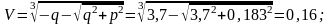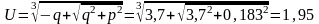 Поскольку q >> p, дискриминант уравнения Д = q2 + p2 > 0 и оно имеет одно действительное и два мнимых решения. Согласно формуле Кардано, действительное решение h = U + V,