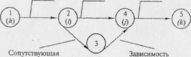 Имеют место случаи, когда две или более работы выходят из одного и того же события, выполняются параллельно и заканчиваются одним н тем же событием. В этом случае получаются две работы с одним и тем же кодом, т.е. 1 —2, что недопустимо. В сетевой модели между двумя событиями может проходить только одна стрелка. Применяется понятие зависимость.