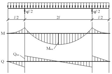 В двухконсольной балке при действии равномерно-распределенной нагрузки максимальный пролетный и изгибающий момент:
