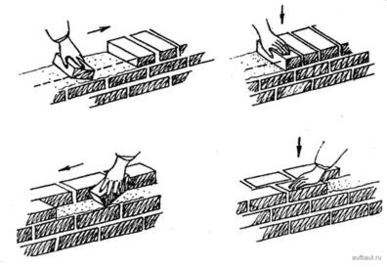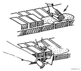 Кладка впустошовку ведется тогда, когда лицевая поверхность будет оштукатуриваться или облицовываться плитками. Со стороны оштукатуриваемой поверхности вертикальные и горизонтальные швы не заполняются раствором на глубину 10-15 м, что способствует более прочному сцеплению штукатурки складкой.