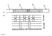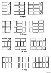 Стены при многорядной системе перевязки (рис.1.12.7) возводят следующим образом. Два первых ряда укладывают по цепной системе перевязки, учитывая при этом, что первый ряд должен быть тычковым, а второй - ложковым. Последующие третий, четвертый, пятый и шестой ряды выкладываются только ложками с перевязкой вертикальных поперечных швов в V, кирпича.
