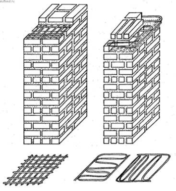 Прямоугольные сетки укладывают не реже чем через пять рядов кирпичной кладки, зигзагообразные — попарно в двух смежных рядах так, чтобы направление прутков в них было взаимно перпендикулярным. За расстояние между зигзагообразными сетками принимают расстояние между сетками одного направления. Марка раствора для армированной кладки должна быть не ниже 25, если кладка будет находиться в сухих условиях, и не ниже 50 при кладке во влажных условиях.