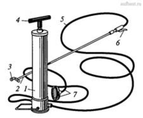 Рис.2.6.4. Инструменты для малярных работ: а - шпатель стальной малый; б - шпатель стальной большой; в – валик меховой; г – кисть -макловица; д – кисть маховая; е - ручной краскопульт СО-20Б: 1 - баллон; 2 - удочка; 3 - форсунка; 4 - ручка плунжерного насоса; 5 - нагнетательный рукав; 6 - рычаг крана; 7 - фильтр с всасывающим рукавом.