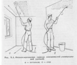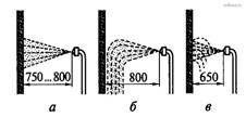 Большое значение имеет также расстояние форсунки от окрашиваемой поверхности; в зависимости от давления красочного состава в аппарате оно может быть от 0,75 до 1 м. При большом расстоянии красочный состав, не достигнув обрабатываемой поверхности, потеряет скорость и осядет пылью на пол; при меньшем - состав, ударяясь о поверхность, будет отскакивать от нее, кроме того, в связи с уменьшением размеров факела при том же расходе красочного состава произойдет перенасыщение красочного слоя с образованием капель и потеков (рис.2.6.6.)
