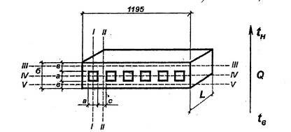; l – длина участка железобетонной плиты, l =1м; a, c – размеры согласно рисунку; n – количество пустот; m – количество железобетонных участков между пустотами;