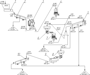 Продукт фракции более 40 мм (выход не более 5-10 %) возвращается с помощью конвейера на додрабливание в конусную дробилку. Из нее фракции щебня попадают на конусную гидравлическую дробилку (7) мелкого дробления через уравнительный бункер с вибропитателем (6). После чего продукт снова попадает на грохот (5), от куда фракции не более 20 мм поступают на уравнительный бункер с вибропитателе (8). Пройдя через бункер фракции щебня попадают на центробежную ударную дробилку (9), затем фракции не более 20 мм проходят классификацию на грохоте (10), где делятся в соответствии и размерами 5-20мм и 0-5мм и складируются в конусах.