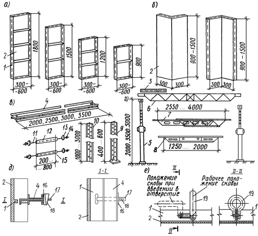 а – плоские щиты; б – угловые щиты; в – элементы крепления; г – поддерживающие устройства; д – узел крепления щитов к схватке; е – узел соединения щитов; 1 – каркас щита; 2 – палуба щита; 3 – щит опалубки перекрытия в рабочем положении; 4 – схватка; 5 – телескопическая стойка; 6 – фермочка-прогон; 7, 8 – раздвижные прогоны; 9 – монтажный уголок; 10 – стойка угловая; 11 – тяги; 12 – конусная распорка; 13 – шайба; 14 – гайка; 15 – трубчатая распорка; 16 – накладка; 17 – крюк; 18 – клин; 19 – пружинная скоба