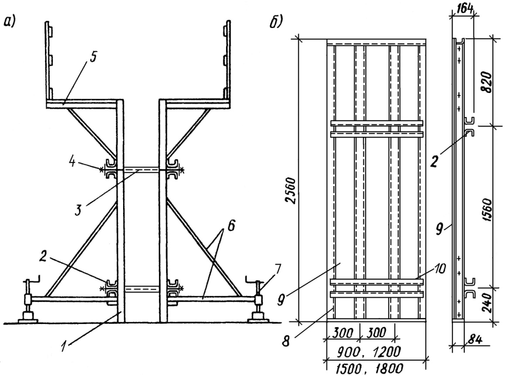 а – общий вид (фрагмент опалубки стены); б – опалубочный щит; 1 – щит; 2, 10 – прогон щита; 3 – тяж-распорка; 4 – гайка; 5 – подмости; 6 – подкос; 7 – домкрат; 8 – ребро щита; 9 – палуба щита