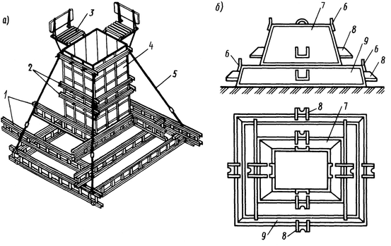 а – универсальный (переналаживаемый) опалубочный блок; б – блок-форма; 1 – несущие фермы; 2 – схватки; 3 – рабочая площадка; 4 – щиты; 5 – расчалка; 6 – монтажные петли; 7 - форма подколонника; 8 – кронштейн для упора домкратов; 9 – форма ступени
