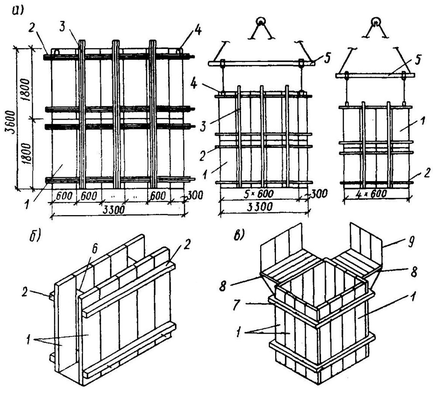 а – в крупнопанельные опалубочные панели; б, в – в пространственные блоки; 1 – щит; 2 – прогон-схватка горизонтальный; 3 – то же, вертикальный; 4 – монтажная петля; 5 – монтажная траверса; 6 – тяж-распорка; 7 – хомут; 8 – подмости; 9 – ограждение