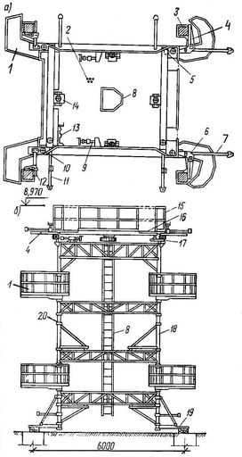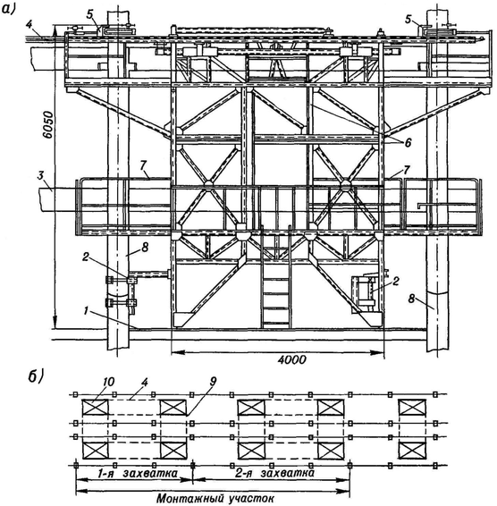 а – вид кондуктора сбоку; б – схема расположения кондукторов; 1 – перекрытие; 2 – нижние угловые фиксаторы; 3 – ригель; 4 – продольная тяга; 5 – верхние угловые фиксаторы; 6 – конструкции кондуктора; 7 – выдвижные люльки; 8 – колонны; 9 – поперечная тяга; 10 – кондуктор