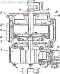 Электрогидравлический толкатель состоит из короткозамкнутого электродвигателя 1 и корпуса 2 с крышкой 10. На валу электродвигателя закреплен центробежный насос 3. В цилиндре 5 перемещается поршень 4. Шток 7 поршня соединяется с рычажной системой тормоза. На верхней крышке установлено резиновое манжетное уплотнение 8, препятствующее выходу масла при движении штока. Для подключения электродвигателя предназначена панель зажимов 11. Масло в электрогидравлический толкатель заливают через верхнее заливное отверстие, закрываемое пробкой 9. Пробка 6 служит для контроля уровня масла. Места соединения корпусных деталей толкателя уплотнены маслостойкими резиновыми кольцами.