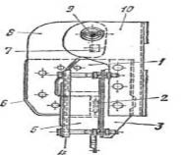 Пакет ярма склепан с двумя угольниками 3 и двумя опорными стойками 10. Катушка 5 электромагнита крепится на ярме с помощью крышки 4. На ярме укреплен короткозамкнутый виток 2, служащий для устранения вибрации и гудения электромагнита.