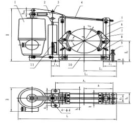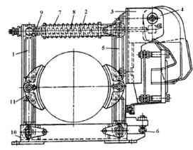 Устройство и принцип работы. Тормоз состоит из следующих основных частей: электрогидравлического толкателя 1, механической части. Механическая часть состоит из: опорной рамы 10, тормозной пружины в сборе с защитным кожухом 11 с таблицей тормозного момента, регулировочного болта пружины 3, верхнего рычага 2, тормозного и вспомогательного рычага 5, регулировочной тяги 4, тормозных колодок 6 с тормозными накладками 7, регулировочного болта колодки 8, регулировочного болта балансировки 9.