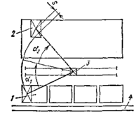 1 — склад, 2 — место монтажа, 3 — кран, 4 — дорога для автотранспорта; ее, а1 — угол поворота крана при совмещении с подъемом груза, а2 — угол поворота крана при совмещении с изменением вылета, S — величина изменения вылета шеи стене здания, груз был бы уже поднят над строящимся этажом здания на безопасную высоту