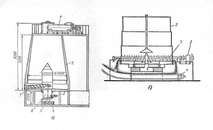 Гомогенизаторы (рис. 24) служат для переработки глины при одновременном увлажнении и последующем выдерживании в течение нескольких часов. Загрузочным механизмом 1 глина подается в башню 2. Во время вращения башни на опорном кольце 6 глина усредняется. Одновременно шнеком 7 отбирается глина, которая поступает по течке 5 на конвейер 4. Башня приводится в движение от электродвигателя 3.